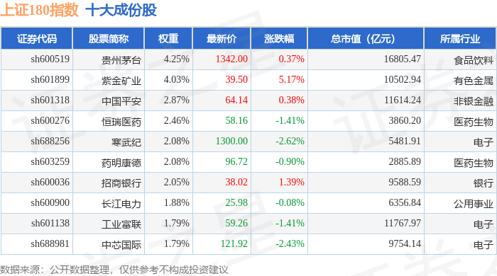 证券之星消息,1月26日,上证180(000010)指数报收于10361.23点,涨0.22%,成交4745.46亿元,换手率0.9%。当日该指数成份股中,上涨的有96家,中金黄金以10.0%的涨幅领涨,下跌的有80家,中国卫通以10.0%的跌幅领跌。