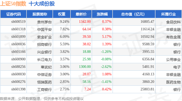 上证50(000016)指数十大成份股详情如下: