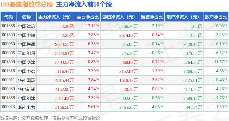 资金流向方面,180基建(000025)指数成份股当日主力资金净流出合计24.51亿元,游资资金净流入合计11.13亿元,散户资金净流入合计13.38亿元。成份股资金流向详情见下表: