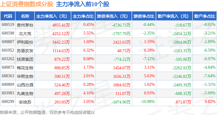 资金流向方面,上证消费(000036)指数成份股当日主力资金净流出合计3.17亿元,游资资金净流入合计8755.97万元,散户资金净流入合计2.29亿元。成份股资金流向详情见下表: