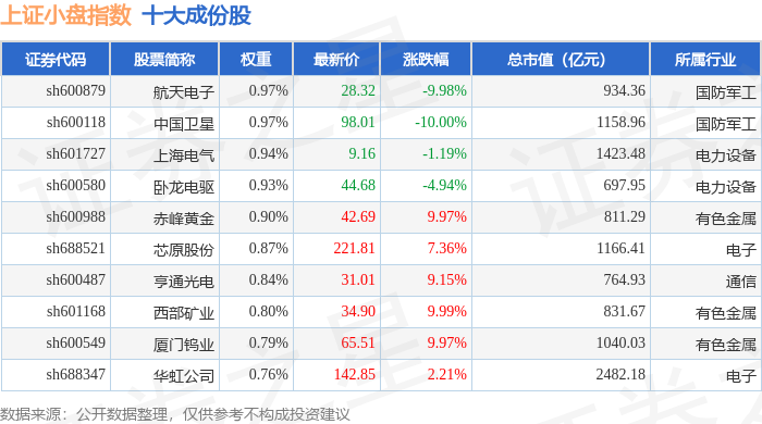 上证小盘(000045)指数十大成份股详情如下: