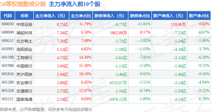 资金流向方面,50等权(000050)指数成份股当日主力资金净流入合计8.26亿元,游资资金净流出合计10.86亿元,散户资金净流入合计2.6亿元。成份股资金流向详情见下表: