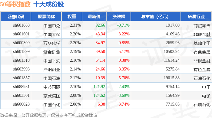 50等权(000050)指数十大成份股详情如下:
