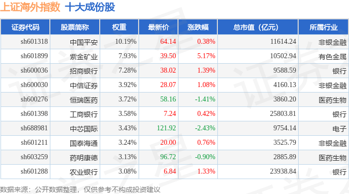 上证海外(000054)指数十大成份股详情如下: