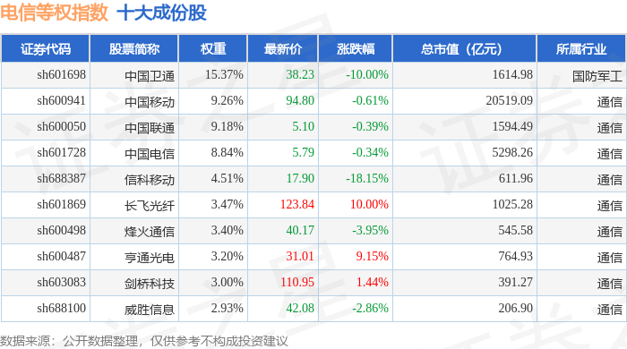 电信等权(000078)指数十大成份股详情如下: