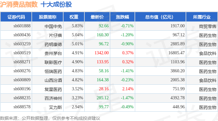 沪消费品(000103)指数十大成份股详情如下: