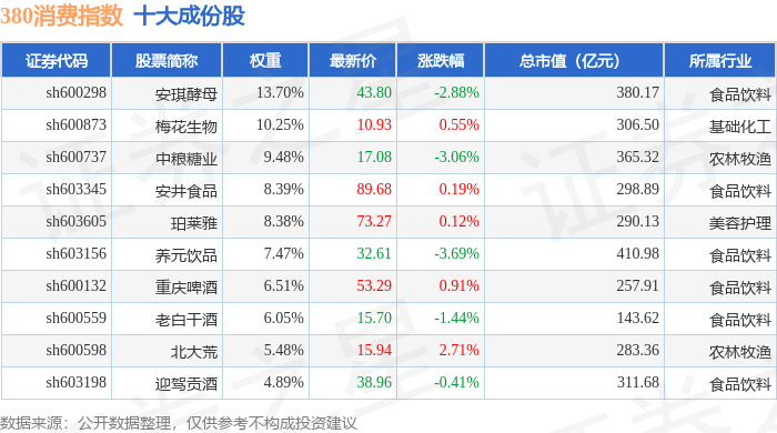 证券之星消息,1月26日,380消费(000108)指数报收于12915.58点,跌0.79%,成交54.59亿元,换手率1.43%。当日该指数成份股中,上涨的有7家,北大荒以2.71%的涨幅领涨,下跌的有10家,养元饮品以3.69%的跌幅领跌。