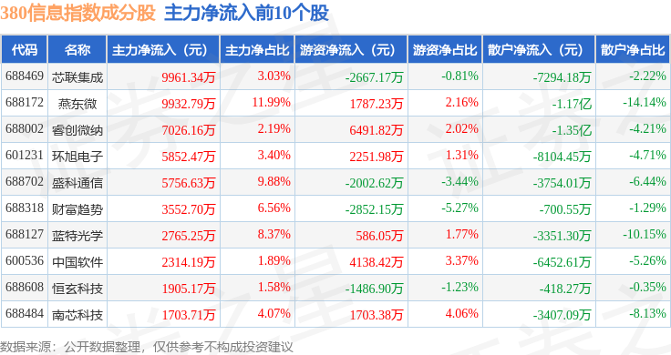 资金流向方面,380信息(000111)指数成份股当日主力资金净流出合计30.98亿元,游资资金净流入合计18.4亿元,散户资金净流入合计12.57亿元。成份股资金流向详情见下表: