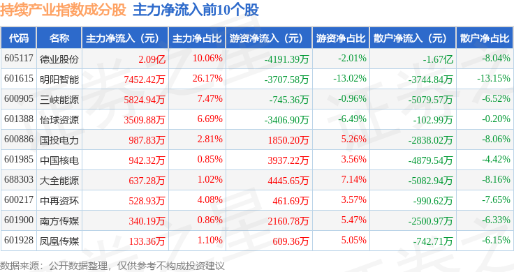 资金流向方面,持续产业(000114)指数成份股当日主力资金净流出合计43.49亿元,游资资金净流入合计18.13亿元,散户资金净流入合计25.36亿元。成份股资金流向详情见下表: