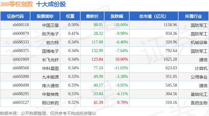 380等权(000115)指数十大成份股详情如下: