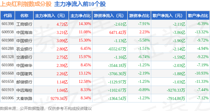 资金流向方面,上央红利(000152)指数成份股当日主力资金净流入合计21.17亿元,游资资金净流出合计4.02亿元,散户资金净流出合计17.15亿元。成份股资金流向详情见下表: