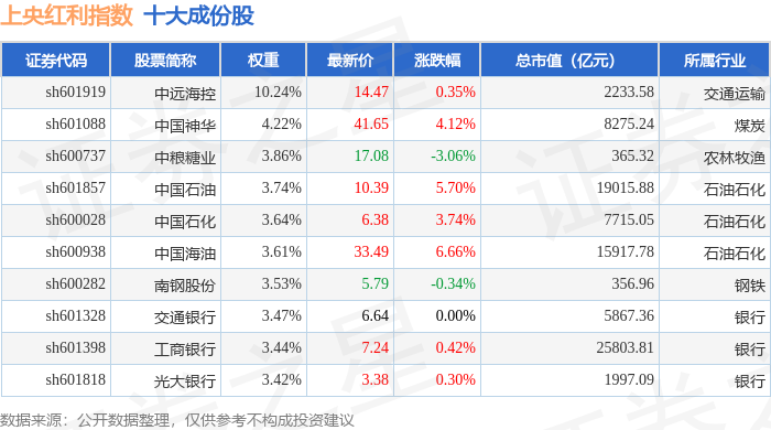证券之星消息,1月26日,上央红利(000152)指数报收于2853.45点,涨1.33%,成交500.18亿元,换手率0.35%。当日该指数成份股中,上涨的有21家,中国黄金以9.98%的涨幅领涨,下跌的有8家,中粮糖业以3.06%的跌幅领跌。