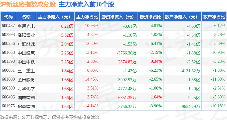 资金流向方面,沪新丝路(000160)指数成份股当日主力资金净流出合计30.53亿元,游资资金净流入合计23.27亿元,散户资金净流入合计7.27亿元。成份股资金流向详情见下表: