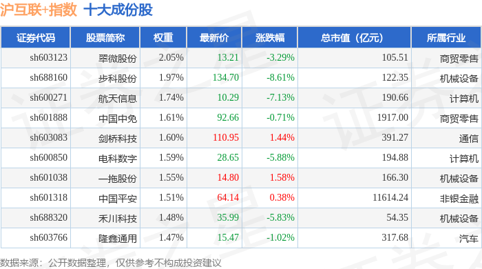 沪互联+(000162)指数十大成份股详情如下: