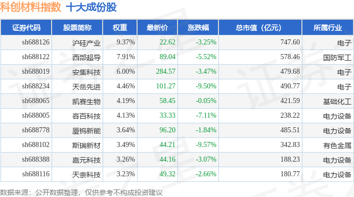 科创材料(000689)指数十大成份股详情如下: