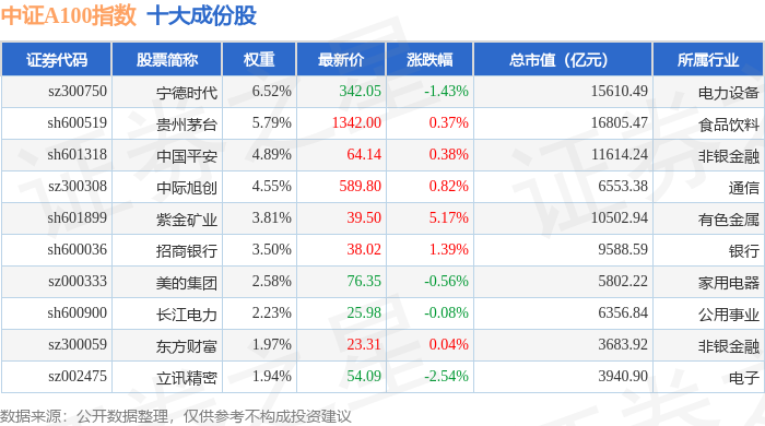 中证A100(000903)指数十大成份股详情如下: