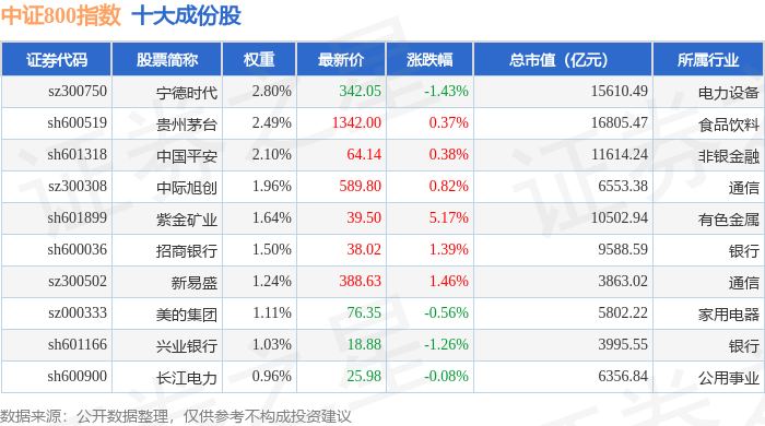 中证800(000906)指数十大成份股详情如下: