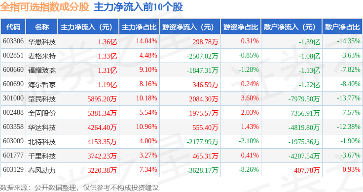 资金流向方面,全指可选(000989)指数成份股当日主力资金净流出合计93.12亿元,游资资金净流入合计25.74亿元,散户资金净流入合计67.38亿元。成份股资金流向详情见下表: