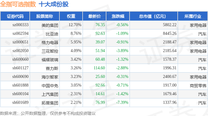 全指可选(000989)指数十大成份股详情如下: