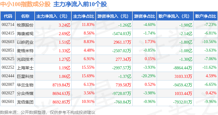 资金流向方面,中小100(399005)指数成份股当日主力资金净流出合计152.87亿元,游资资金净流入合计20.72亿元,散户资金净流入合计132.15亿元。成份股资金流向详情见下表: