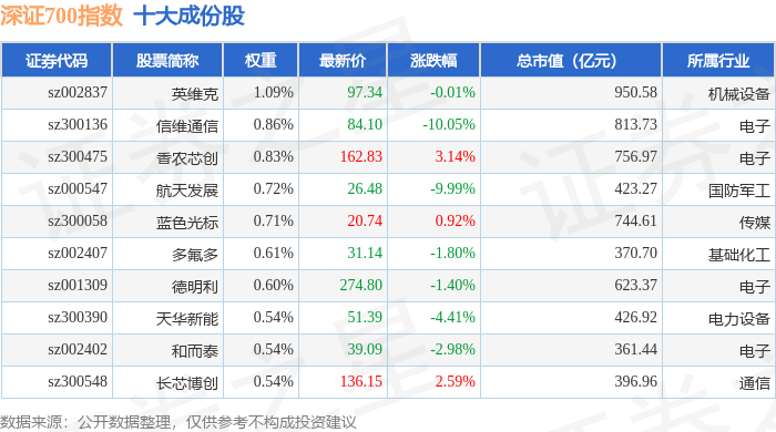 证券之星消息,1月26日,深证700(399010)指数报收于9767.97点,跌1.52%,成交5756.88亿元,换手率4.93%。当日该指数成份股中,上涨的有191家,迈克生物以20.03%的涨幅领涨,下跌的有500家,亚光科技以13.41%的跌幅领跌。