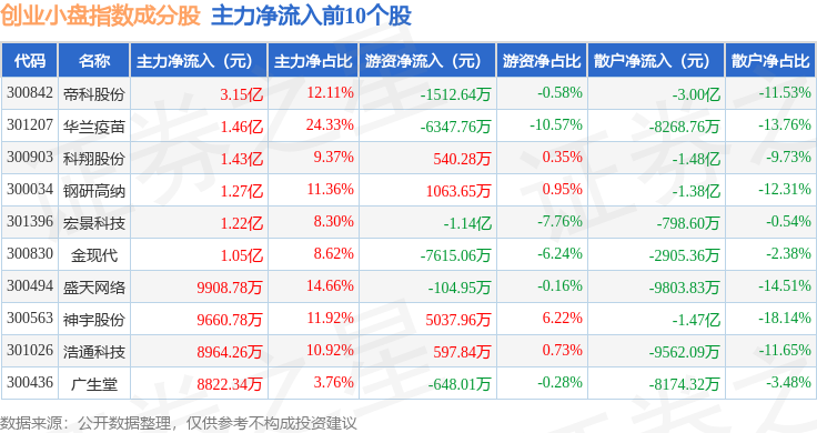 资金流向方面,创业小盘(399020)指数成份股当日主力资金净流出合计64.17亿元,游资资金净流入合计26.03亿元,散户资金净流入合计38.14亿元。成份股资金流向详情见下表: