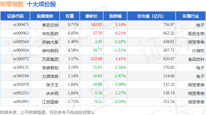 资金流向方面,批零指数(399236)成份股当日主力资金净流出合计9.67亿元,游资资金净流入合计8299.97万元,散户资金净流入合计8.84亿元。成份股资金流向详情见下表: