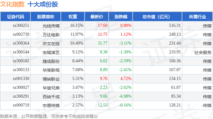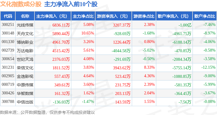 资金流向方面,文化指数(399248)成份股当日主力资金净流出合计4.45亿元,游资资金净流入合计3.5亿元,散户资金净流入合计9538.4万元。成份股资金流向详情见下表: