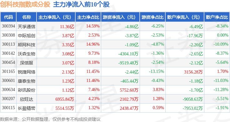 资金流向方面,创科技(399276)指数成份股当日主力资金净流出合计39.55亿元,游资资金净流入合计14.17亿元,散户资金净流入合计25.38亿元。成份股资金流向详情见下表: