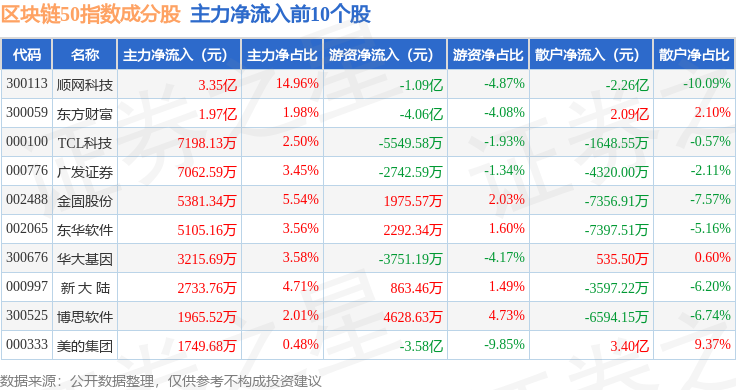 资金流向方面,区块链50(399286)指数成份股当日主力资金净流出合计43.99亿元,游资资金净流出合计2.13亿元,散户资金净流入合计46.12亿元。成份股资金流向详情见下表: