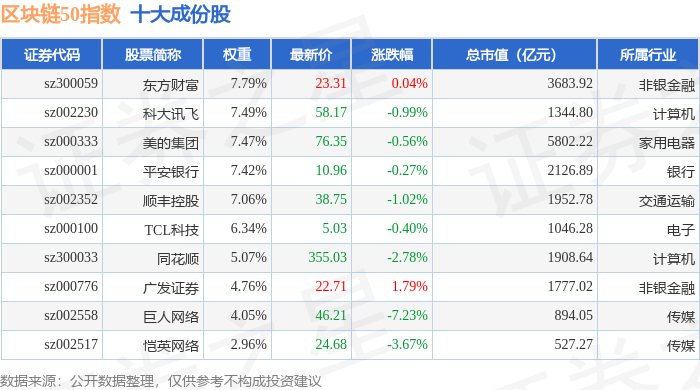 区块链50(399286)指数十大成份股详情如下: