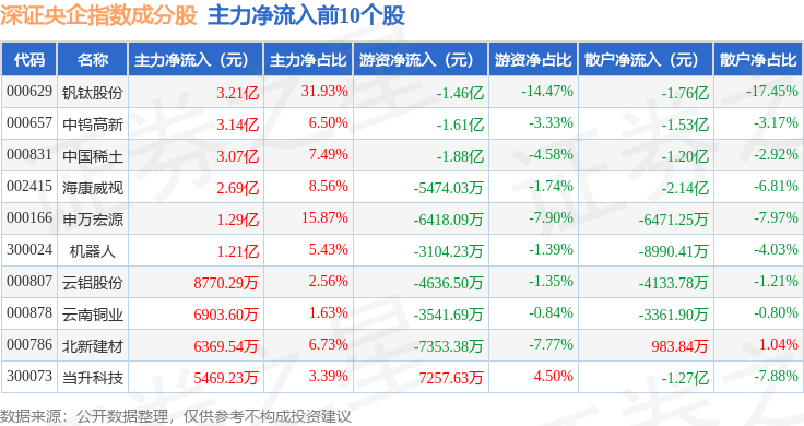 资金流向方面,深证央企(399335)指数成份股当日主力资金净流出合计23.2亿元,游资资金净流入合计1.71亿元,散户资金净流入合计21.49亿元。成份股资金流向详情见下表: