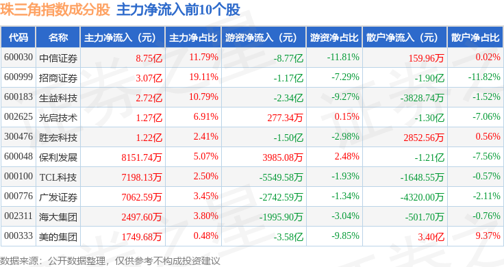 资金流向方面,珠三角(399356)指数成份股当日主力资金净流出合计38.84亿元,游资资金净流出合计19.57亿元,散户资金净流入合计58.41亿元。成份股资金流向详情见下表: