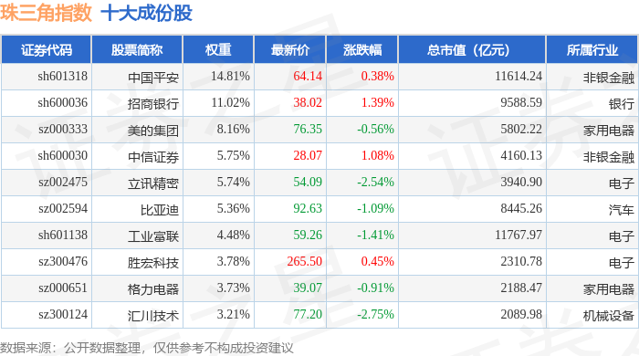 珠三角(399356)指数十大成份股详情如下: