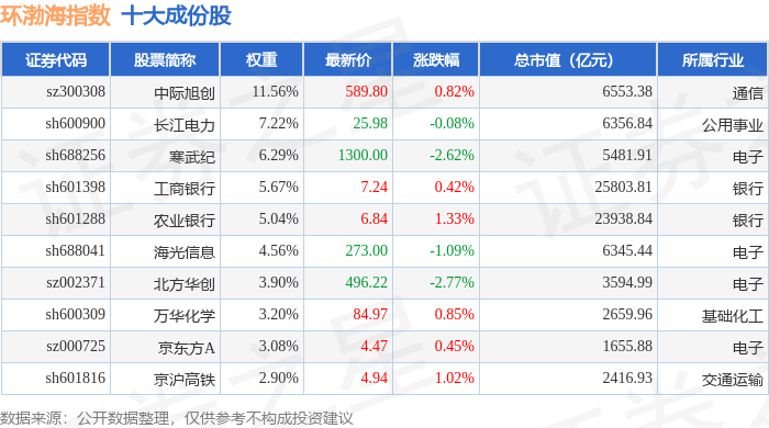 环渤海(399357)指数十大成份股详情如下: