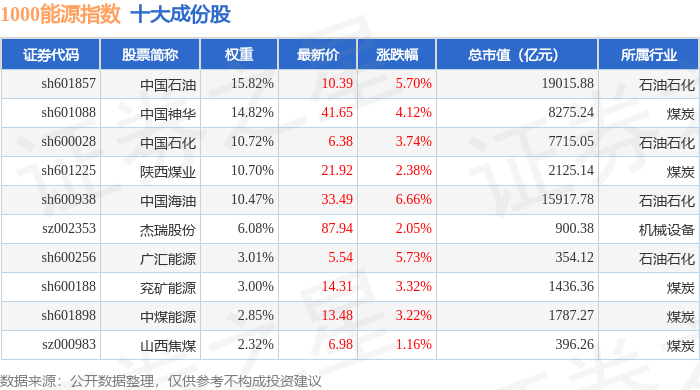 1000能源(399381)指数十大成份股详情如下: