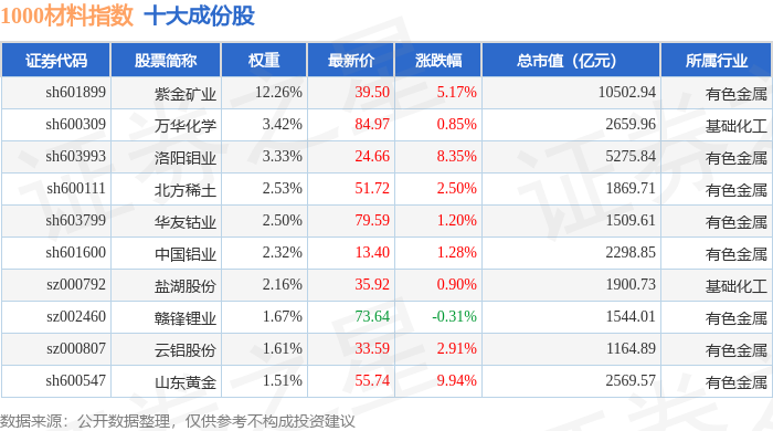 1000材料(399382)指数十大成份股详情如下:
