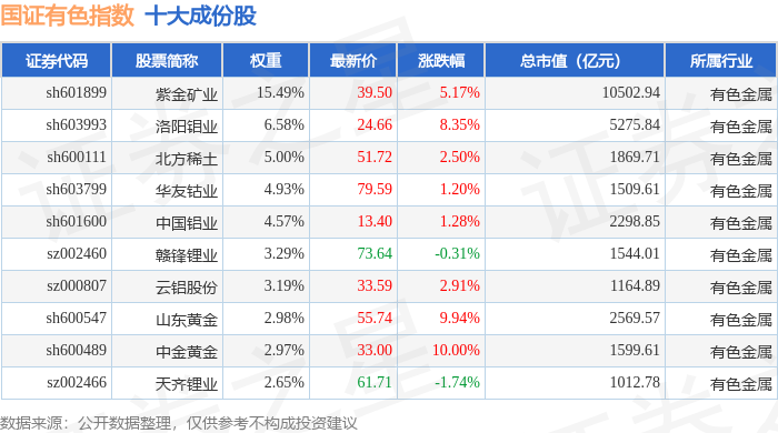 国证有色(399395)指数十大成份股详情如下: