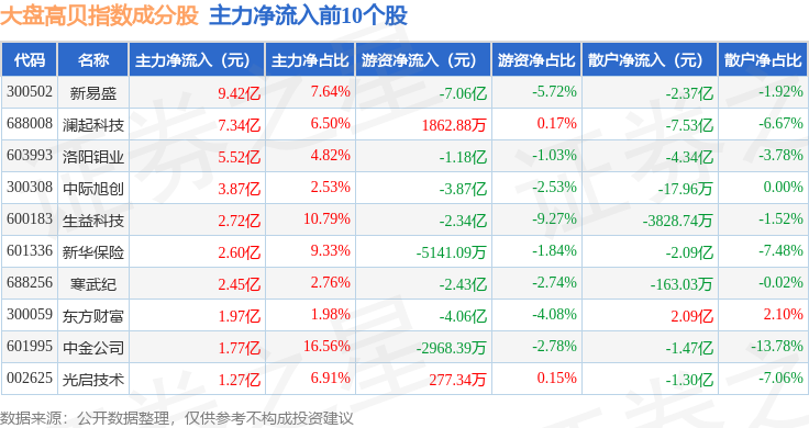 资金流向方面,大盘高贝(399405)指数成份股当日主力资金净流出合计126.18亿元,游资资金净流入合计21.76亿元,散户资金净流入合计104.42亿元。成份股资金流向详情见下表:
