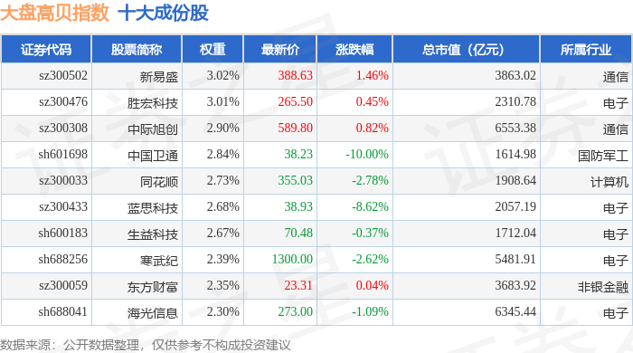 大盘高贝(399405)指数十大成份股详情如下:
