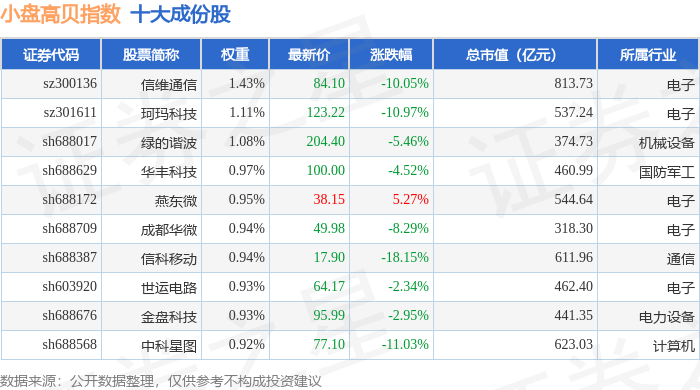 小盘高贝(399409)指数十大成份股详情如下: