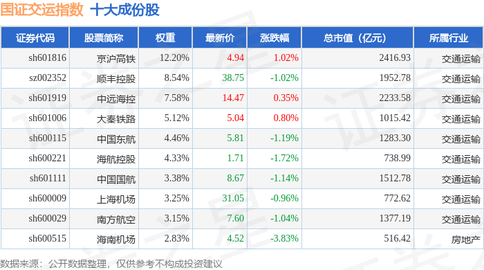 国证交运(399433)指数十大成份股详情如下: