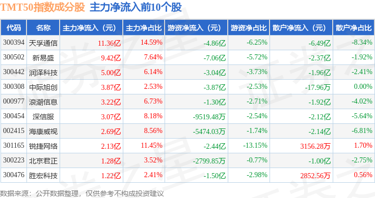 资金流向方面,TMT50(399610)指数成份股当日主力资金净流出合计62.36亿元,游资资金净流出合计3901.44万元,散户资金净流入合计62.75亿元。成份股资金流向详情见下表: