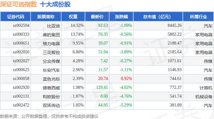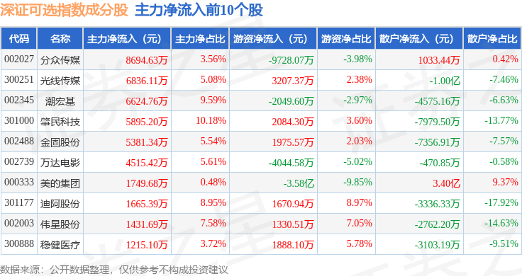 资金流向方面,深证可选(399616)指数成份股当日主力资金净流出合计88.25亿元,游资资金净流入合计15.13亿元,散户资金净流入合计73.12亿元。成份股资金流向详情见下表: