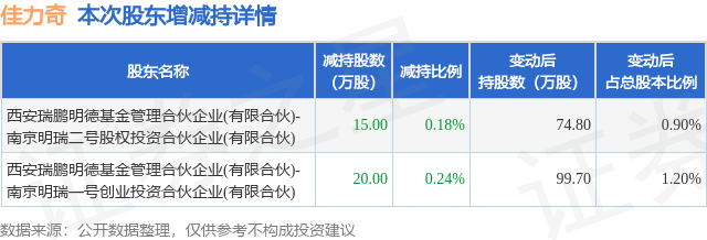 证券之星消息,1月26日佳力奇发布公告《佳力奇:关于股东减持计划期限届满暨减持结果的公告》,其股东西安瑞鹏明德基金管理合伙企业(有限合伙)-南京明瑞二号股权投资合伙企业(有限合伙)、西安瑞鹏明德基金管理合伙企业(有限合伙)-南京明瑞一号创业投资合伙企业(有限合伙)于2026年1月15日至2026年1月23日间合计减持35.0万股,占公司目前总股本的0.4218%,变动期间该股股价下跌1.68%,截止1月23日收盘报52.8元。