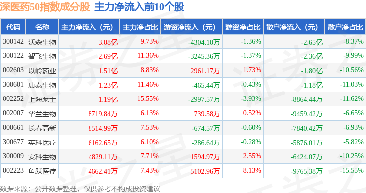 资金流向方面,深医药50(399647)指数成份股当日主力资金净流入合计6.52亿元,游资资金净流入合计2.61亿元,散户资金净流出合计9.14亿元。成份股资金流向详情见下表: