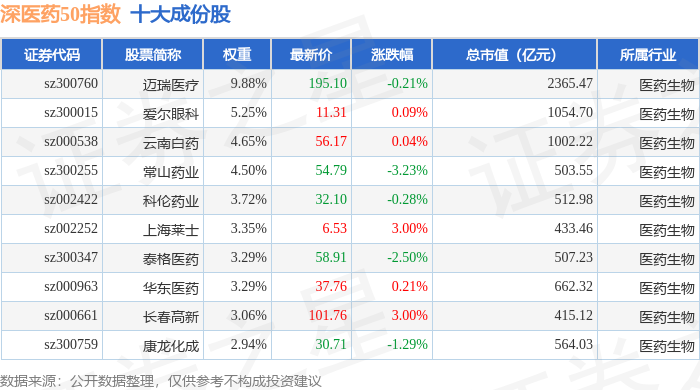 深医药50(399647)指数十大成份股详情如下: