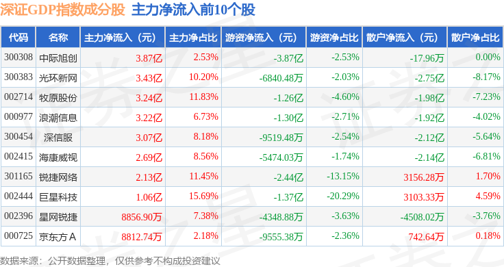 资金流向方面,深证GDP(399648)指数成份股当日主力资金净流出合计102.88亿元,游资资金净流入合计7.09亿元,散户资金净流入合计95.78亿元。成份股资金流向详情见下表: