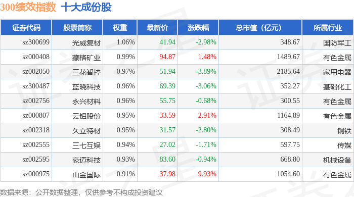 300绩效(399657)指数十大成份股详情如下: