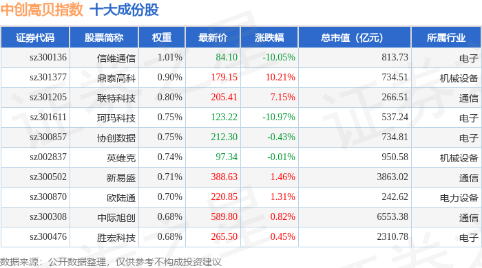 中创高贝(399666)指数十大成份股详情如下: